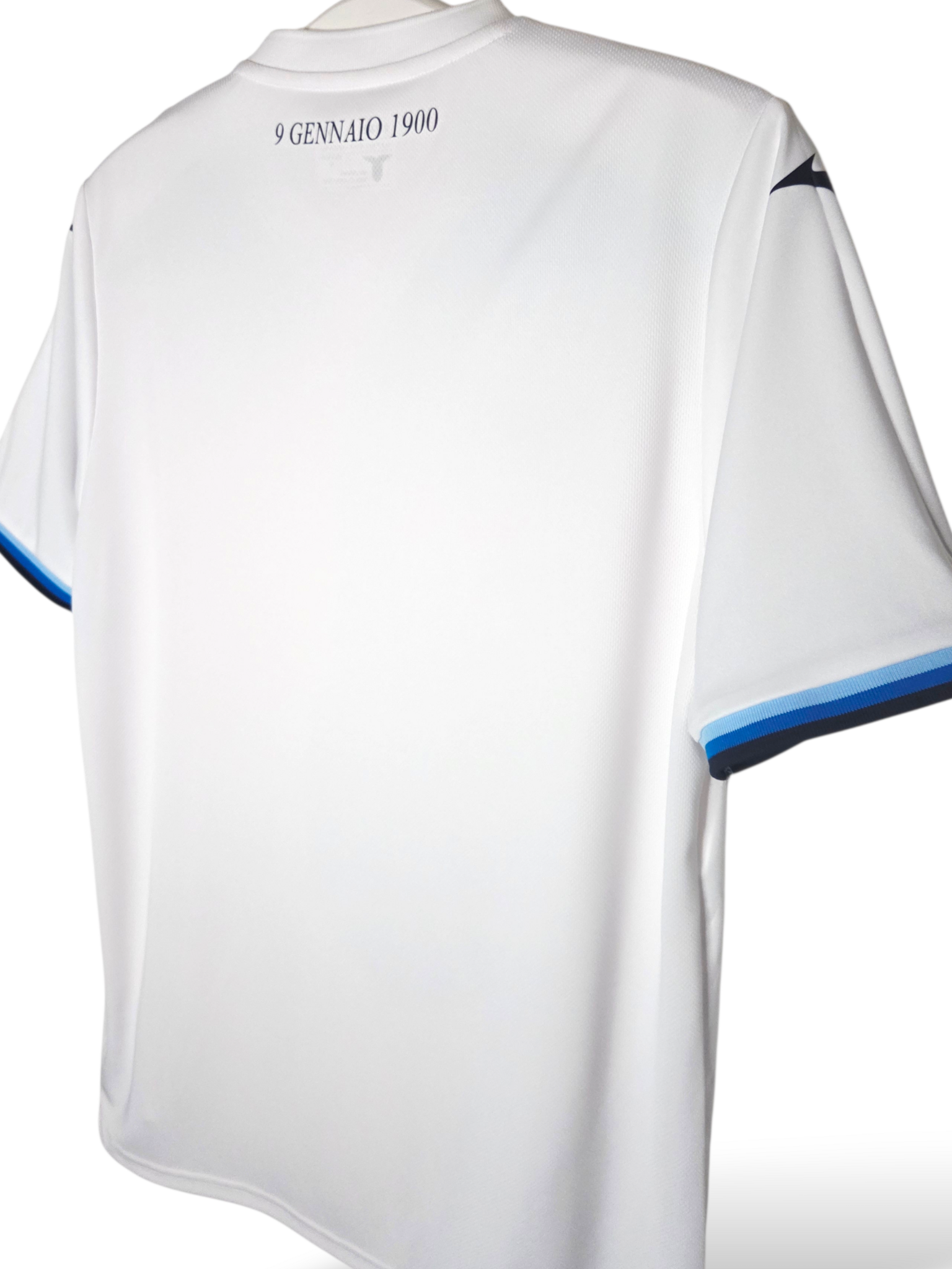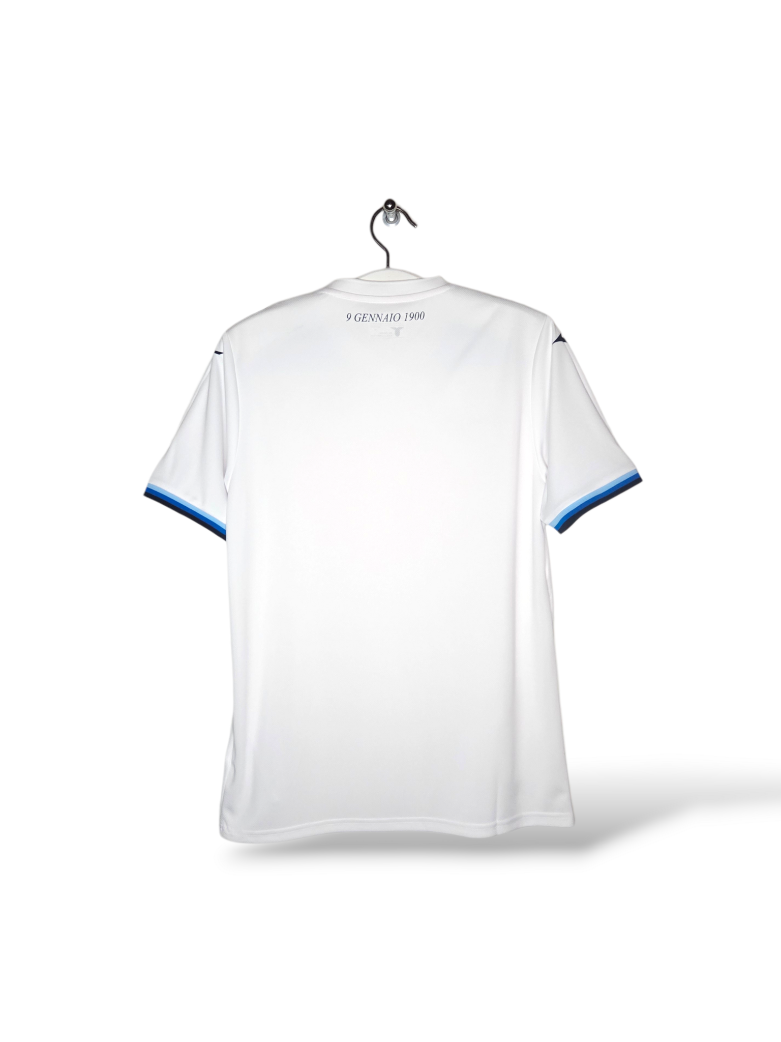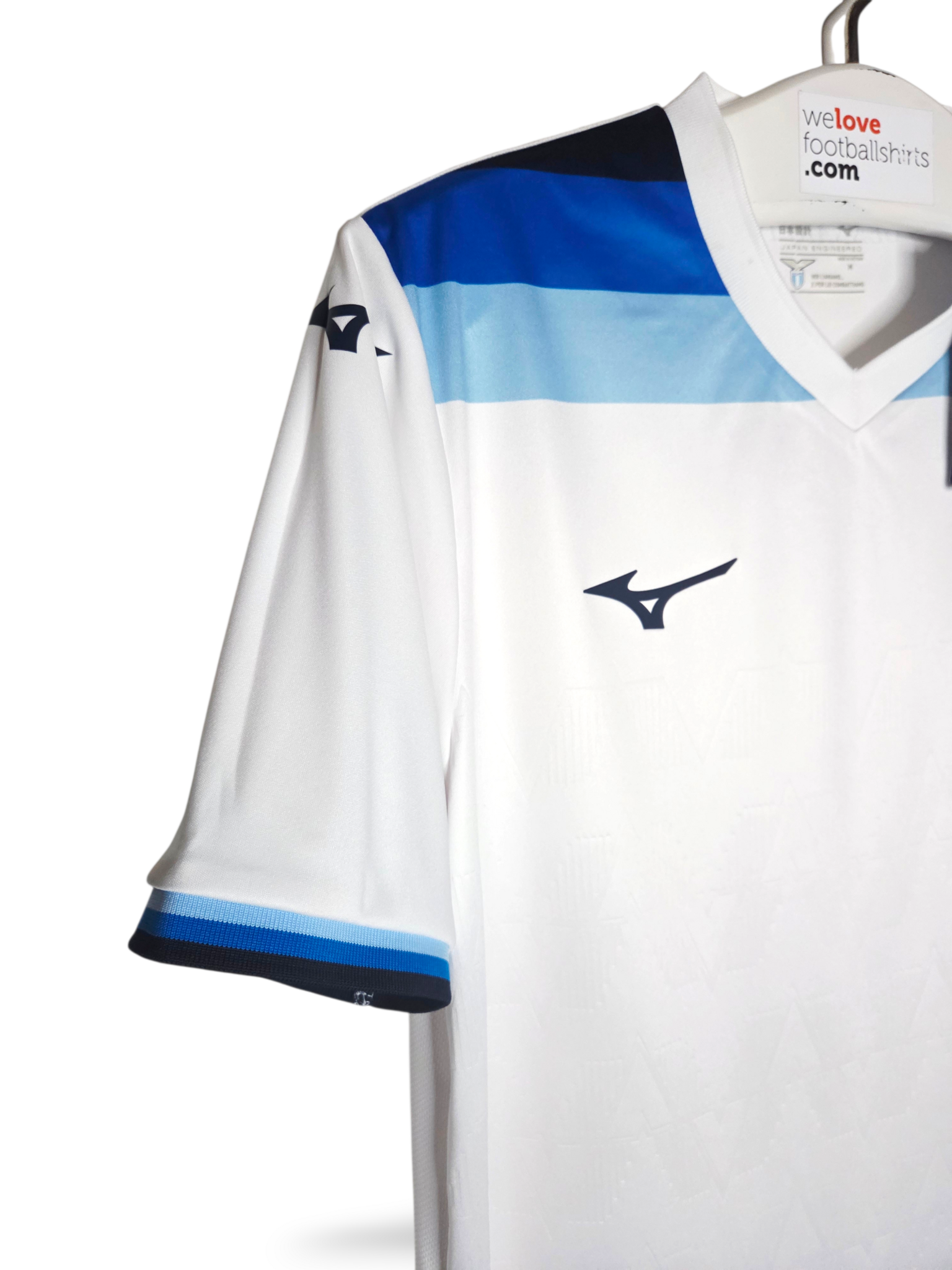 Designinspiration: Das Trikot besticht durch seinen Retro-Stil und ist überwiegend weiß mit Seitenstreifen und Bündchen in drei Blautönen: Hellblau, Königsblau und Marineblau. Ein geprägtes geometrisches Muster, inklusive des Schriftzugs „S.S. Lazio“, ist in den Stoff eingearbeitet.