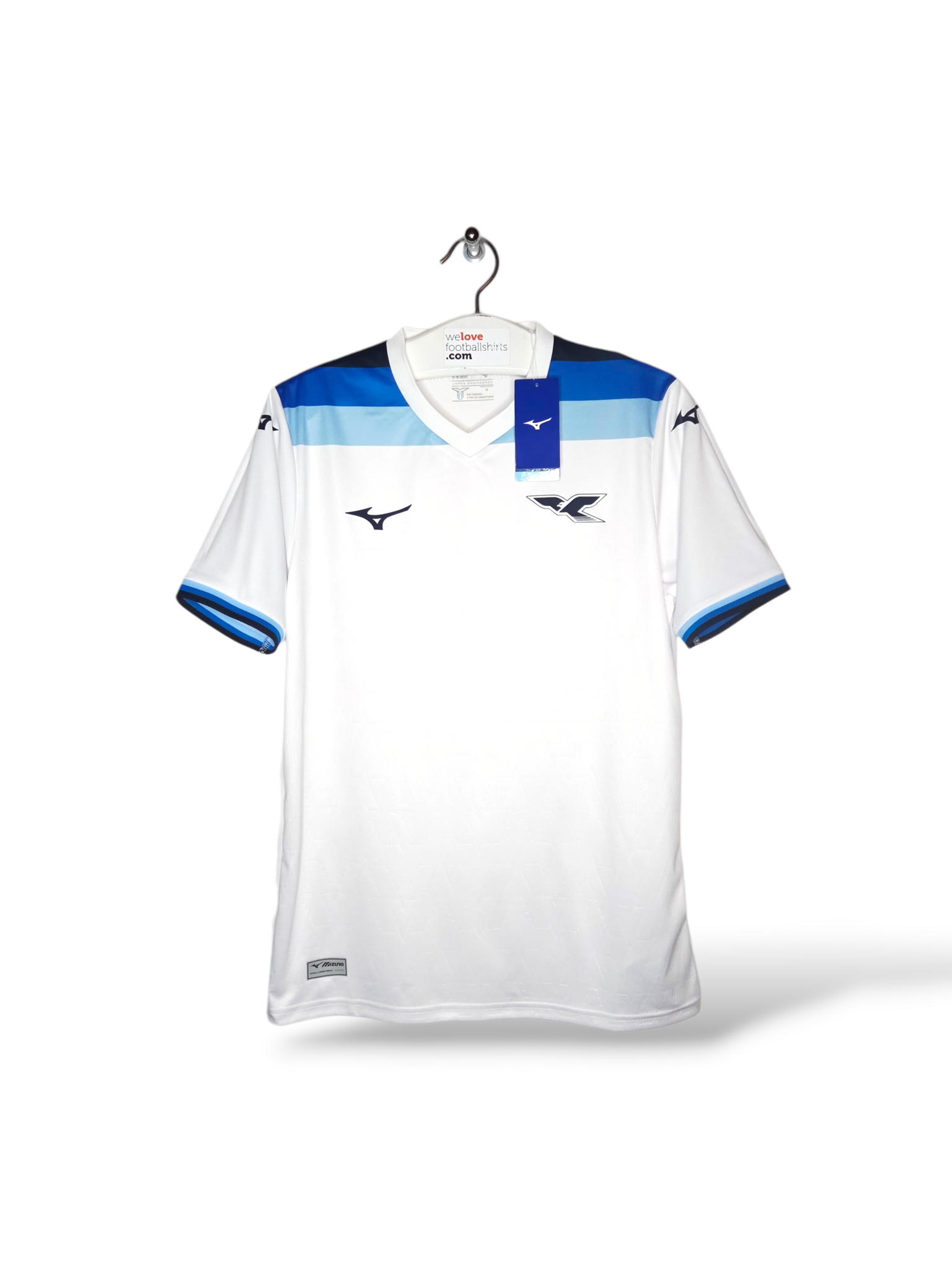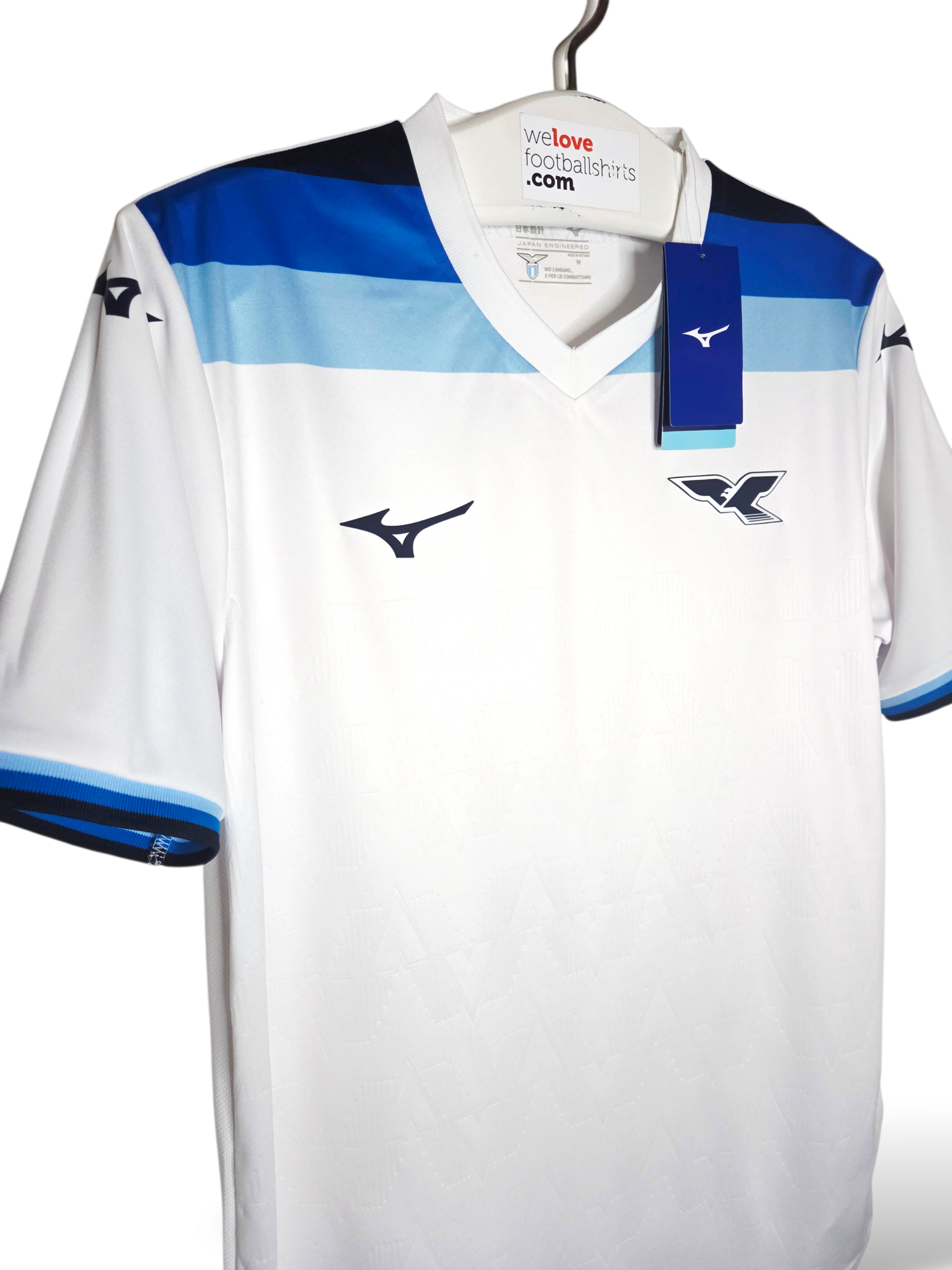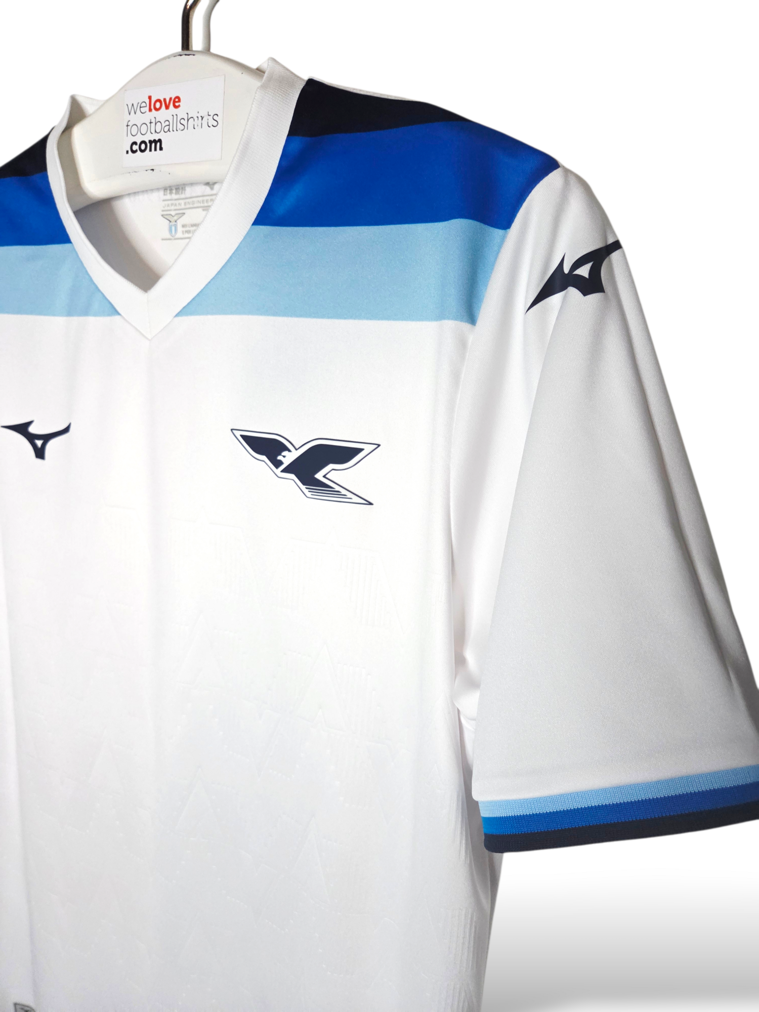 Designinspiration: Das Trikot besticht durch seinen Retro-Stil und ist überwiegend weiß mit Seitenstreifen und Bündchen in drei Blautönen: Hellblau, Königsblau und Marineblau. Ein geprägtes geometrisches Muster, inklusive des Schriftzugs „S.S. Lazio“, ist in den Stoff eingearbeitet.