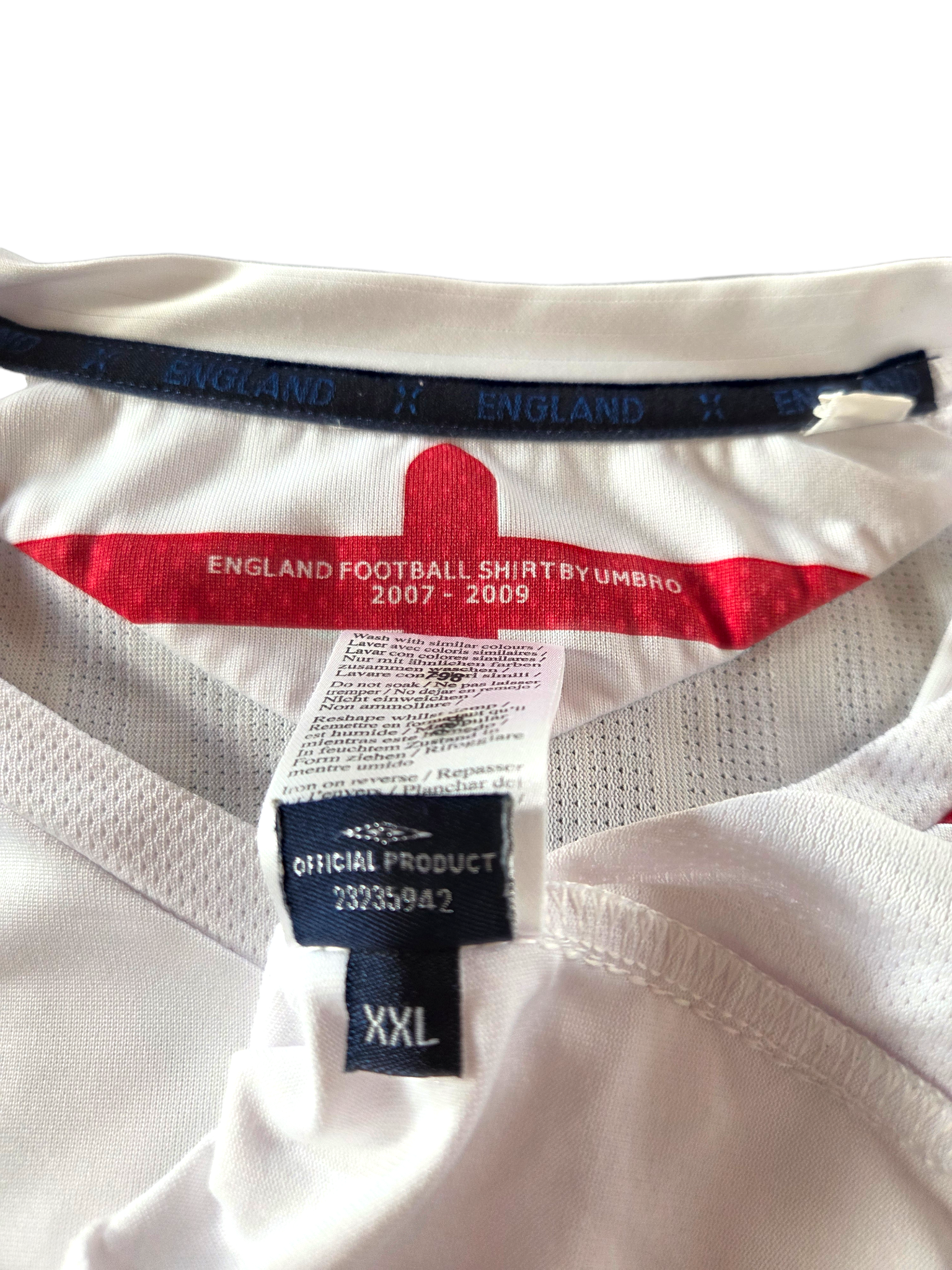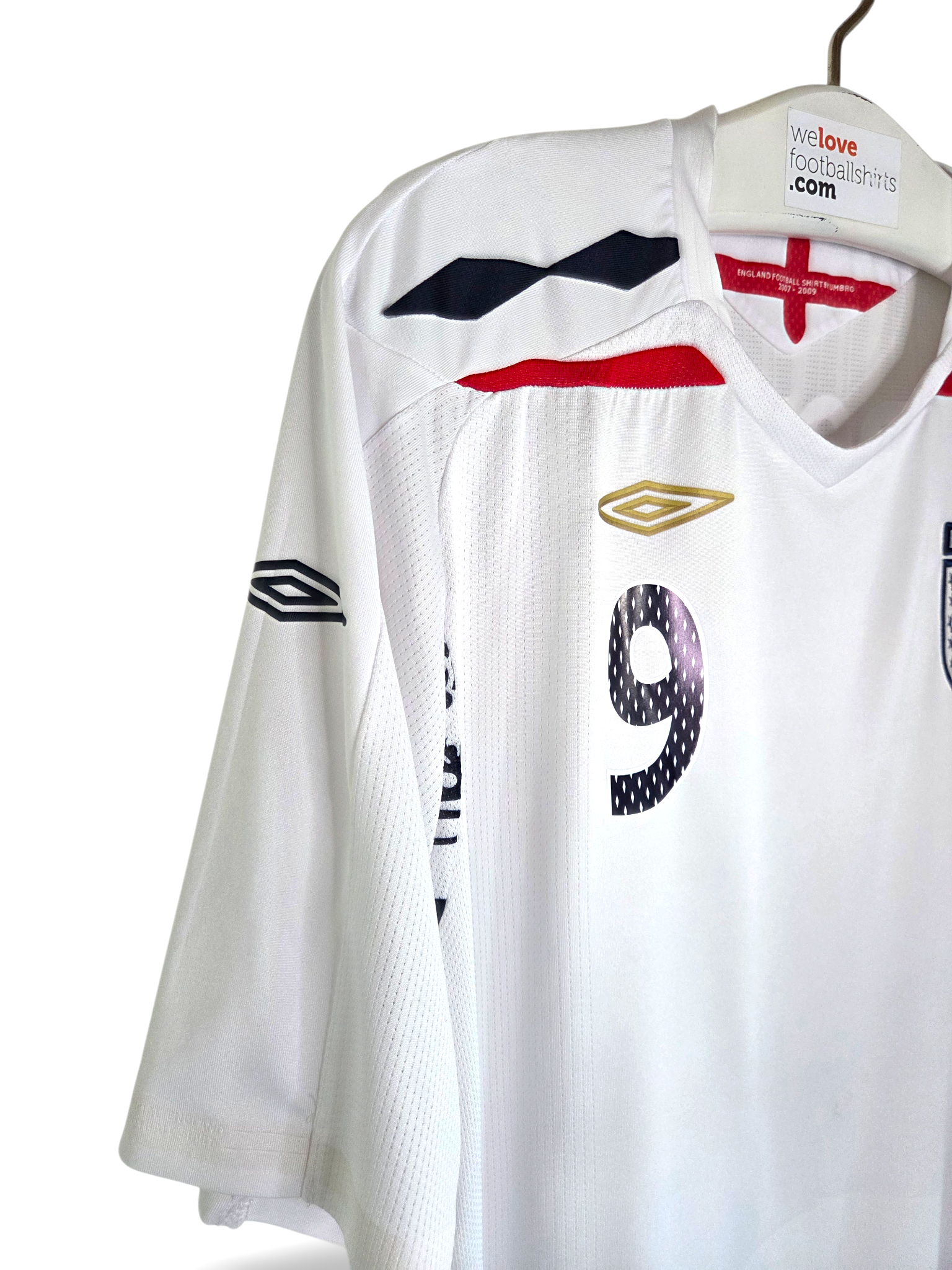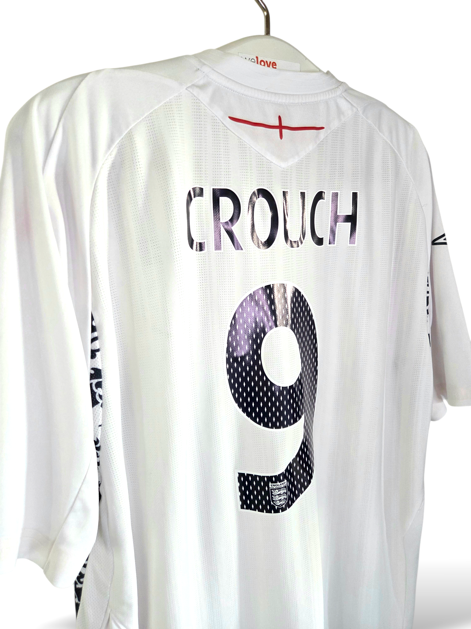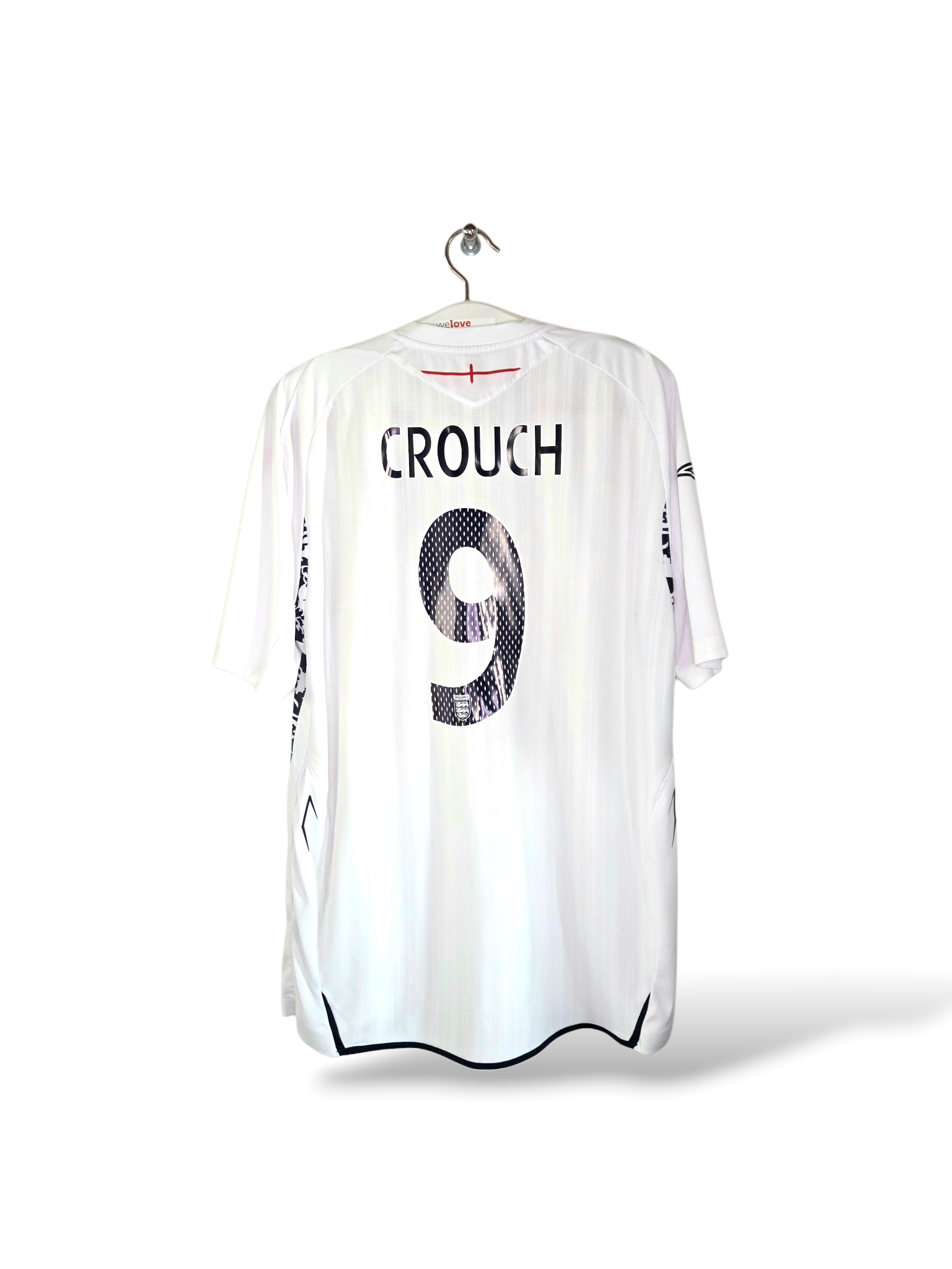 Original England home shirt from the EURO 2008 era, produced by Umbro. This size XXL item features the number 9 on the back along with the name of Peter Crouch – the tall, technically gifted striker known for his excellent goal-scoring ratio for the English national team.