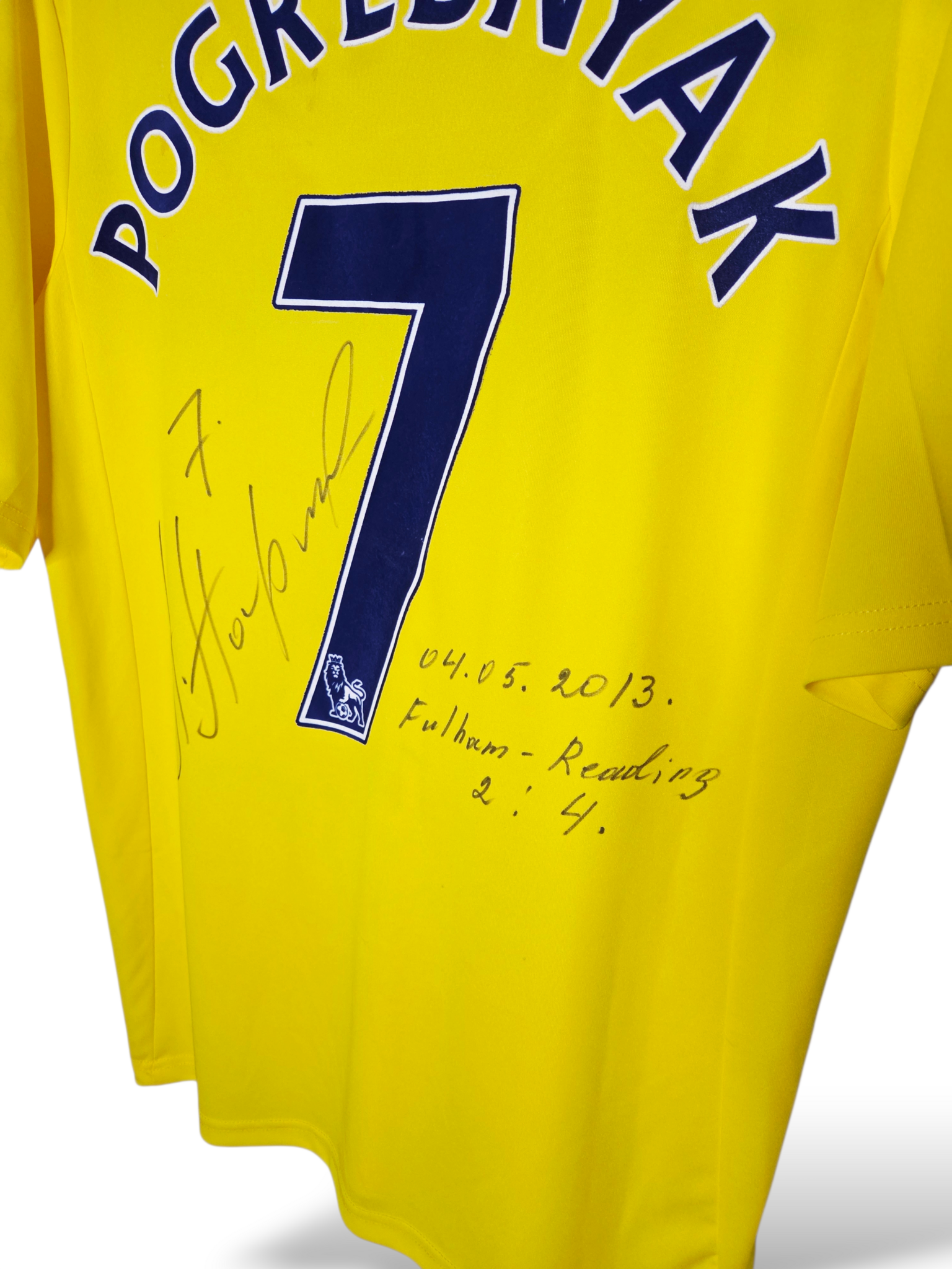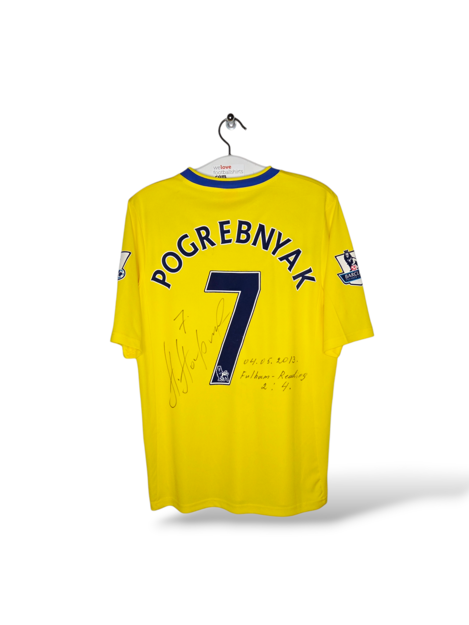 Unique matchworn Reading FC away shirt from the 2012/2013 season, worn by Russian striker Pavel Pogrebnyak during the Premier League match Fulham – Reading (2-4) on May 4, 2013.