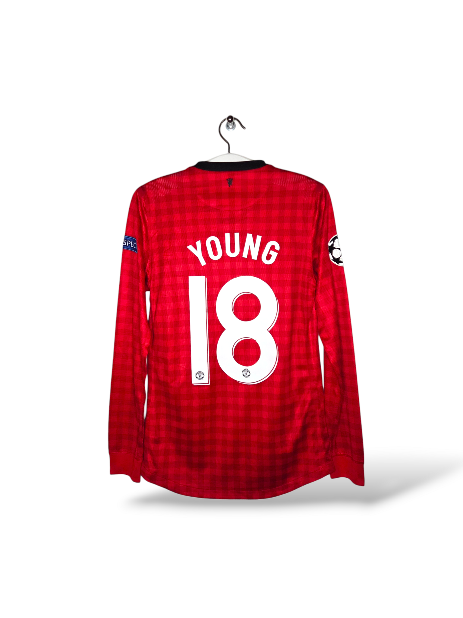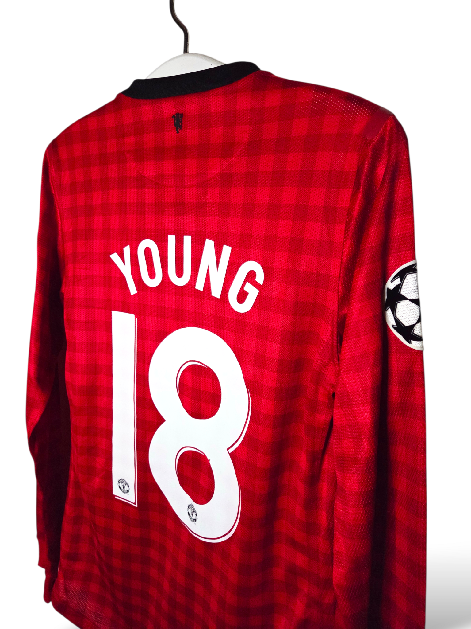 Uniek Manchester United thuisshirt uit het seizoen 2012/13, uitgevoerd in de Champions League-versie met lange mouwen. Dit betreft een origineel Match-Issue shirt, klaargemaakt voor Europees gebruik en gebruikt door Ashley Young tijdens de Champions League-wedstrijd tegen CFR Cluj op 5 december 2012 op Old Trafford.